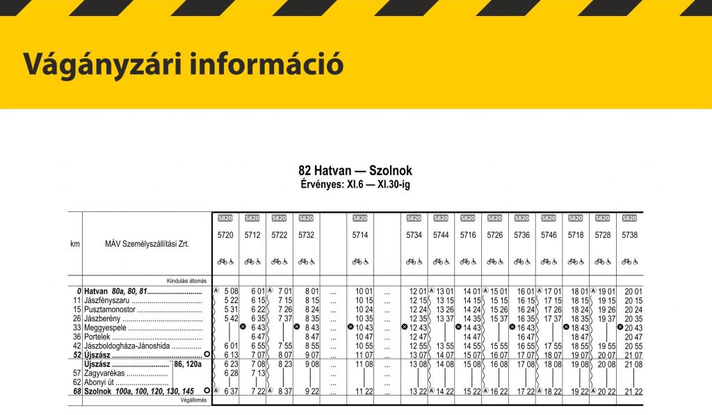 A MÁV Személyszállítási Zrt. tájékoztatta az Igazgatóságot, hogy 2025. november 6-tól november 30-ig az Albertirsa és Ceglédbercel-Cserő állomások között végzett pályakarbantartási munkák miatt a 82 sz. Hatvan – Szolnok vasútvonalon egyes vonatok módosított menetrend szerint közlekednek.